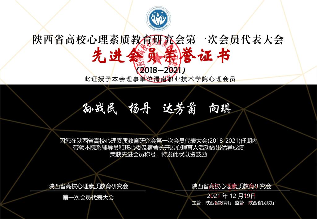 近日,省高校心理素质教育研究会对理事单位心理育人工作成就进行了表彰,公司达芳菊教授、向琪副教授两位老师荣获“先进会员”荣誉称号。向琪老师还荣获“2021年度陕西省高校十佳心理师提名”荣誉称号。