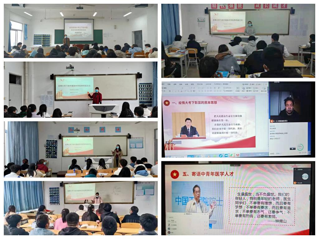 3月18日起,51名专兼职思政教师陆续在《毛泽东思想和中国特色社会主义理论体系概论》《心理健康与职业生涯》等课程中融入疫情防控知识及思政育人元素,为全校21级和19级五年制123个教学班共上123节“抗疫”思政大课。课中,老师们立足疫情防控实际情况,结合所带班级、专业、员工特点引导员工了解、认识本次疫情,鼓励员工积极参与防疫抗疫,通过阐述中华优秀传统文化中的“民本”思想和集体精神在疫情防控中发挥的积极作用,使员工从中汲取战胜疫情的巨大力量。课后,组织员工集体讨论、撰写心得体会,分享学习感悟。