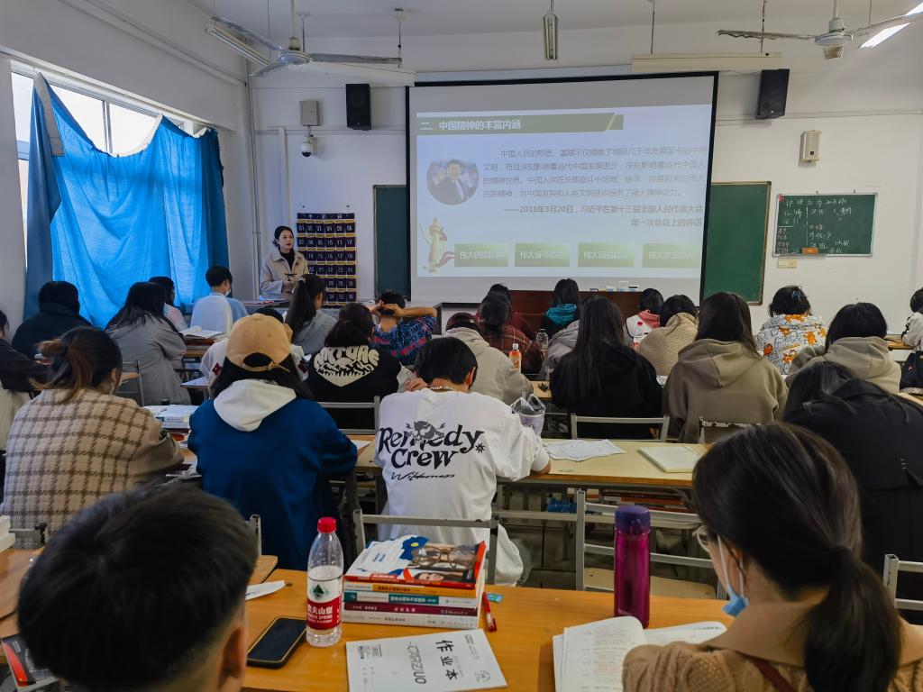 11月9日下午,德法教研室青年教师同倩倩在公北409教室进行了《思想道德与法治》的公开课。她重点讲述了中国精神的丰富内涵之伟大的创造精神、奋斗精神、团结精神和梦想精神,通过一桩桩感人事迹、一件件伟大的科技成果、一幅幅形象生动的图片将中国精神进行了生动形象的诠释。