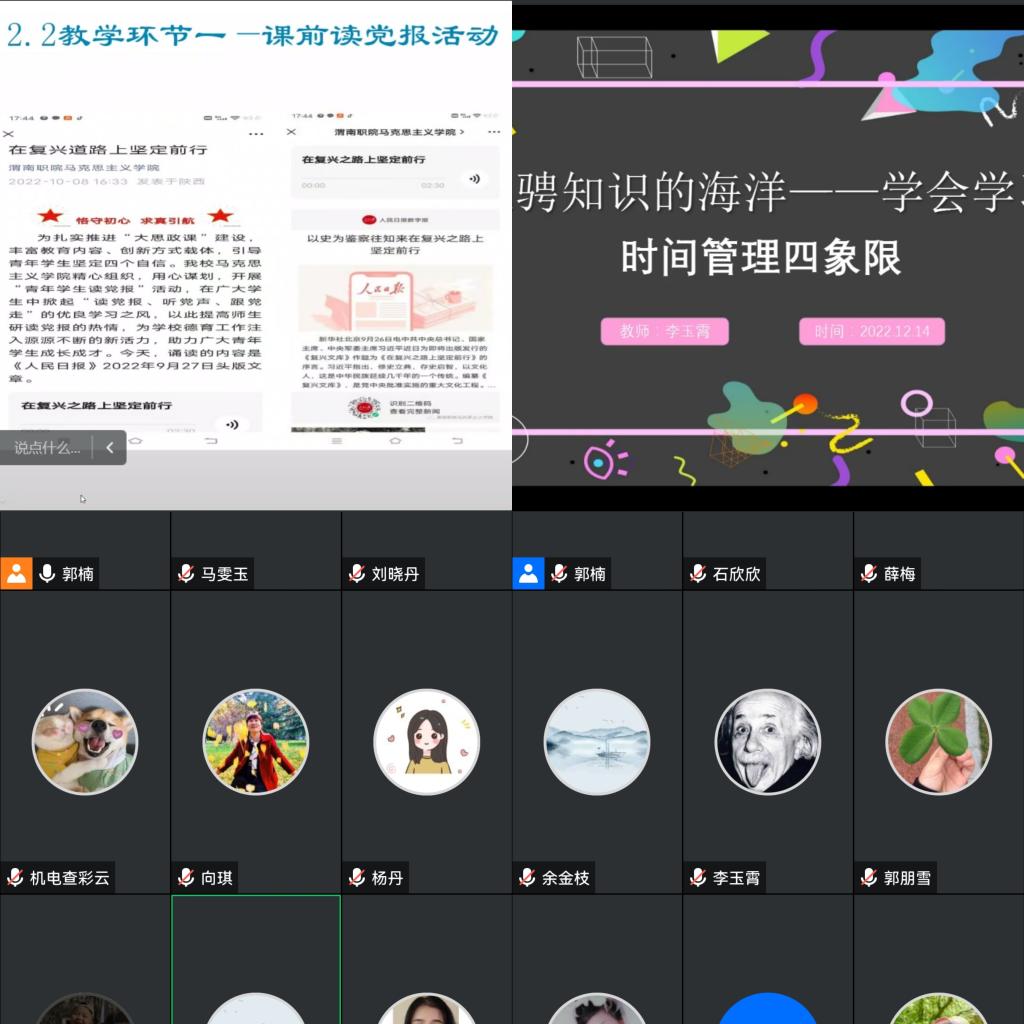 为提升思政课教学水平,12月15日下午,bst365根据公司教学能力比赛要求线上开展教学能力比赛初赛,德法与心理教研室的2个参赛团队参加了本次比赛。经理史改侠、副经理王晓莉、副高以上职称教师达芳菊、韩秀阁、王爱、常俊侠6位老师担任评委,比赛由王晓莉主持,无课教师观摩了比赛。