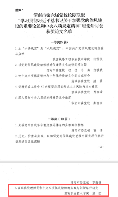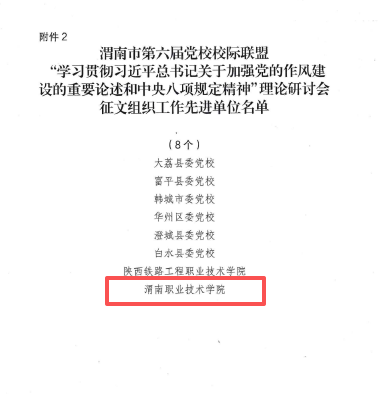 近日,中共渭南市委党校印发了《关于表彰渭南市第六届党校校际联盟“学习贯彻习近平总书记关于加强党的作风建设的重要论述和中央八项规定精神”理论研讨会优秀论文和征文组织工作先进单位的通报》,公司因在本次征文活动中组织有力、动员广泛、成果显著,被授予先进单位荣誉称号。思政课教师裴昉副教授撰写的学术论文《高职院校教师贯彻中央八项规定精神的实践与创新路径研究》喜获二等奖。